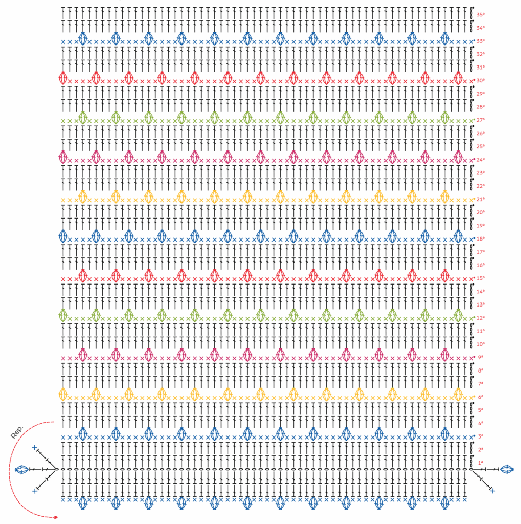 Continúa siguiendo el diagrama 1, trabajando en carreras circulares y alternando los colores según el diseño.