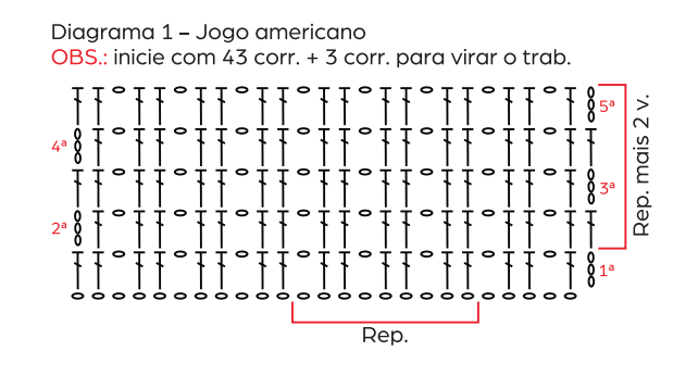 Instrucciones del Borde: Engancha el hilo y comienza tejiendo una vuelta de puntos bajos alrededor de todo el perímetro de la pieza rectangular. Es importante que en cada esquina tejas 1 punto bajo, 2 cadenetas y 1 punto bajo en el mismo espacio, lo cual le dará la forma triangular al borde. En los lados laterales, simplemente teje 1 punto bajo en cada punto de base que encuentres. Al completar la vuelta, ciérrala con un punto bajísimo. A partir de esta base de puntos bajos, tejes las vueltas circulares para completar el borde. La 1ª vuelta del borde decorativo (según el diagrama 2) se construye sobre la vuelta de puntos bajos: inicia con el patrón que muestre el gráfico (que parece ser la base de los picos) y luego en las siguientes vueltas, crea los picos calados usando la combinación de puntos altos y cadenetas. Repite este patrón alrededor de la pieza y luego de forma circular hasta que el borde esté completo. Finaliza y esconde las hebras. Recuerda que la indicación es hacer dos piezas iguales para completar el juego de posaplatos.