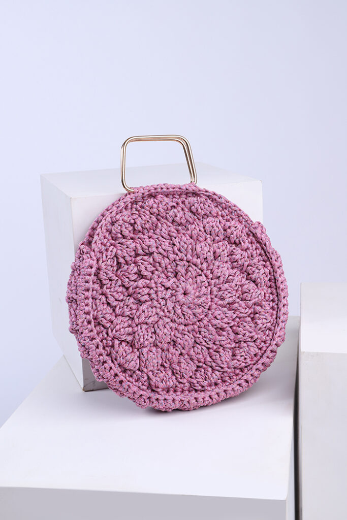 Durante la última vuelta de cada motivo, coloca el asa: cuando llegues a la parte superior, teje 10 p.b. abrazando la parte baja del asa metálica para fijarla.