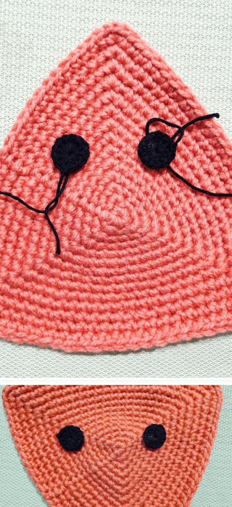 Con una aguja de lana, cose los ojos sobre el mantelito.