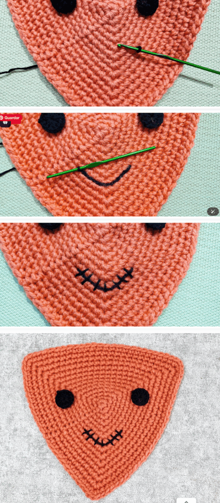 Usa punto deslizado en superficie para crear la sonrisa, o bien puedes usar una aguja de lana para bordarla.