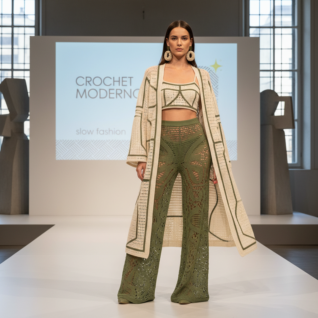 El Crochet Moderno es la evolución contemporánea de la técnica. Se aleja de los manteles rígidos de antaño para enfocarse en la estética actual, el minimalismo y la moda de pasarela. Se caracteriza por usar fibras naturales (como el algodón orgánico o el bambú) y diseños con estructuras mucho más arquitectónicas y fluidas, adaptadas al estilo de vida de hoy.