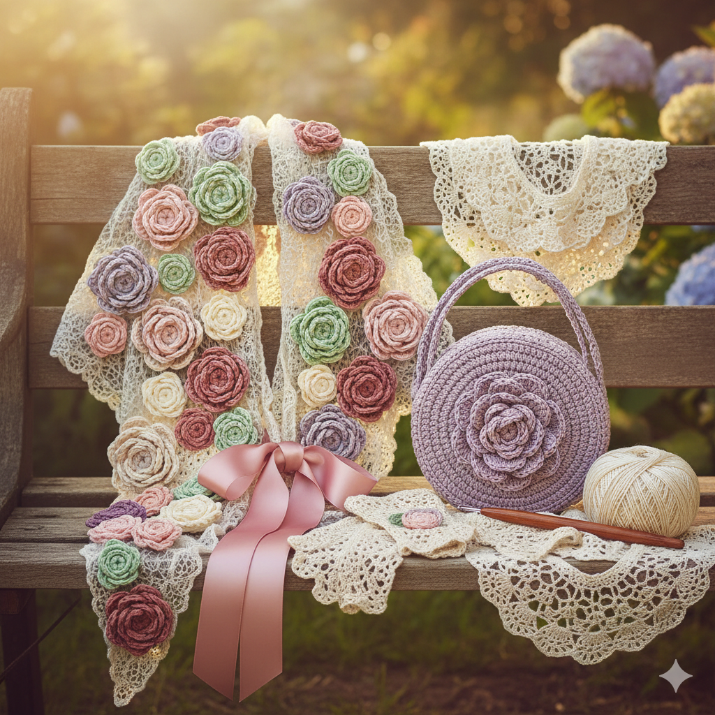 El Crochet Romántico se centra en la belleza suave y los detalles minuciosos. A diferencia de otros estilos más estructurados, este busca la fluidez y la ornamentación delicada. Se inspira en la estética «Coquette» y en el romanticismo clásico, creando piezas que evocan ternura y elegancia. Es el estilo ideal para quienes disfrutan tejiendo flores, encajes y accesorios que parecen sacados de un cuento de hadas.