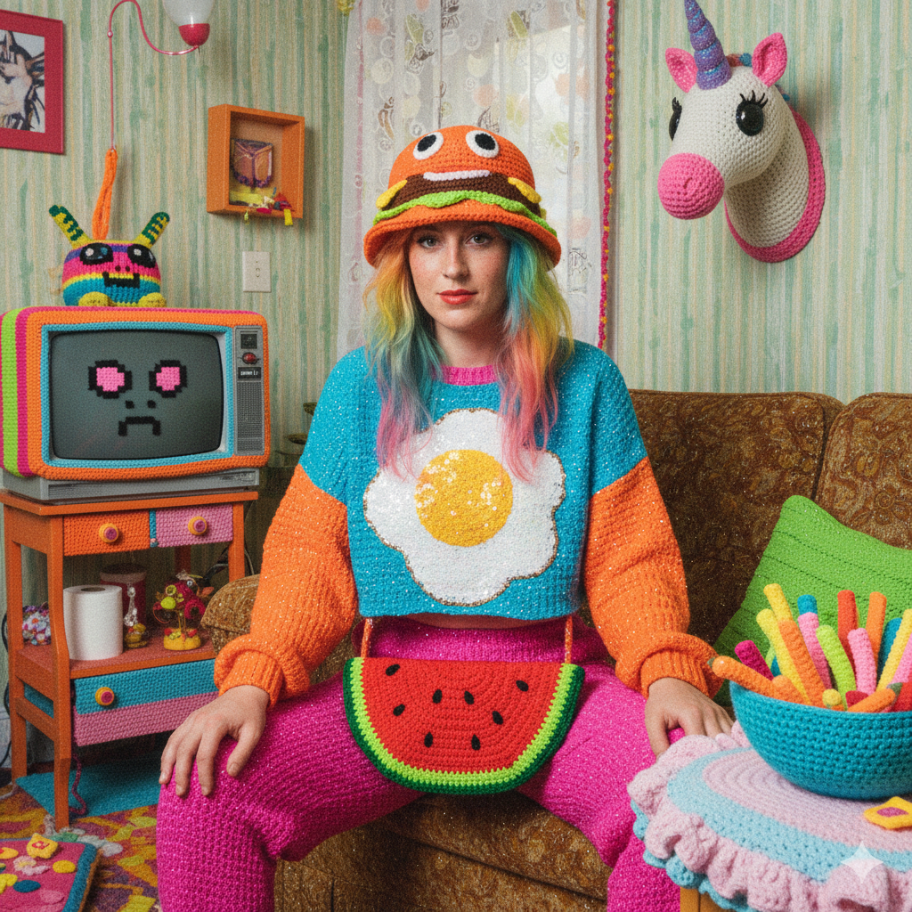 El Crochet Kitsch celebra lo «feo-bonito», lo exagerado y lo irónico. Se aleja totalmente de la elegancia tradicional para abrazar una estética estridente, llena de humor y nostalgia. Es un estilo que convierte objetos cotidianos en piezas tejidas sin ninguna función más que la de divertir. En el mundo kitsch, nada es «demasiado»: los colores chillan, las formas son raras y el resultado es siempre una pieza de conversación.