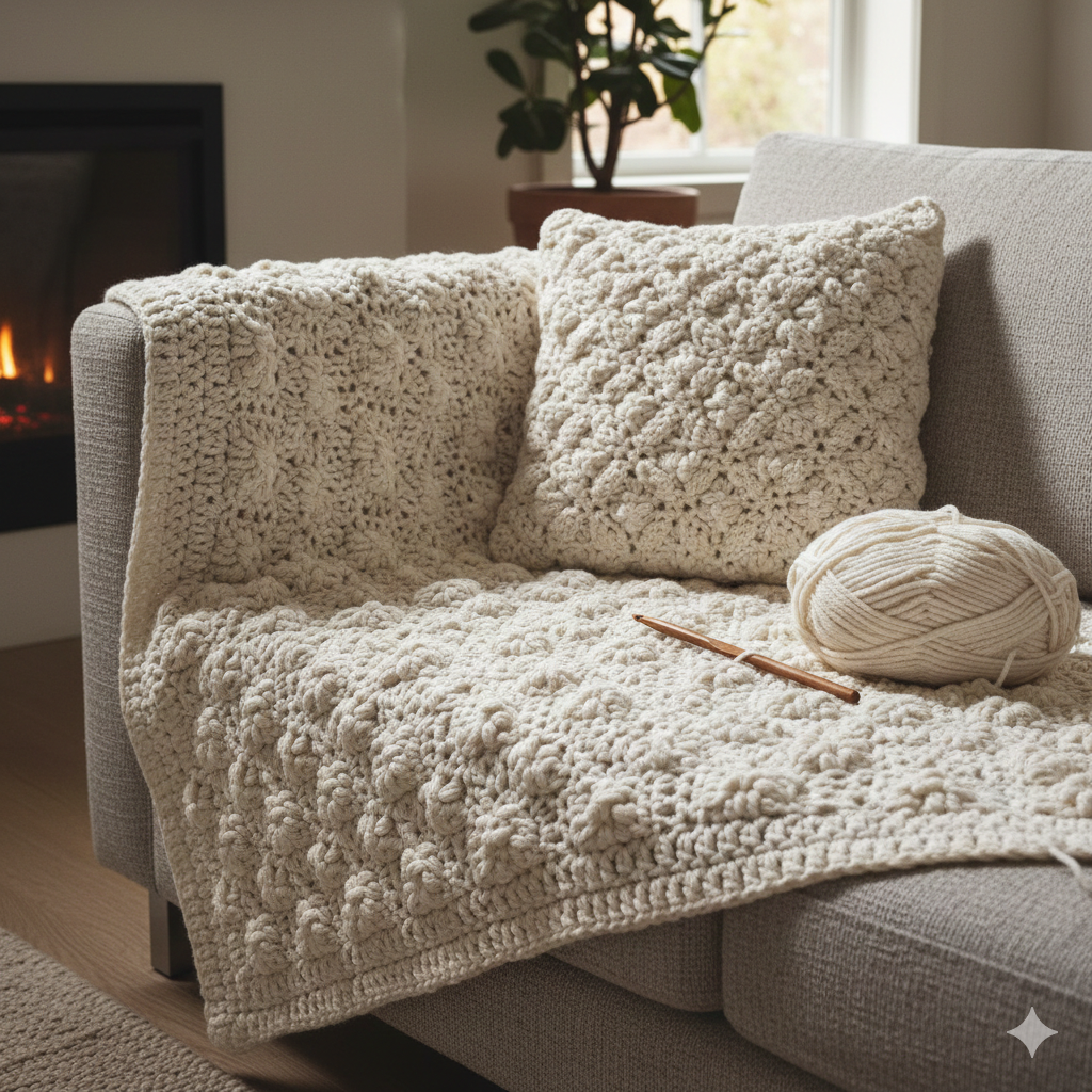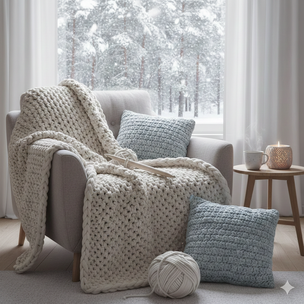 - Tejidos XXL (Chunky): Es muy común el uso de lanas extremadamente gruesas y ganchillos gigantes para crear mantas y cojines voluminosos. 🧶