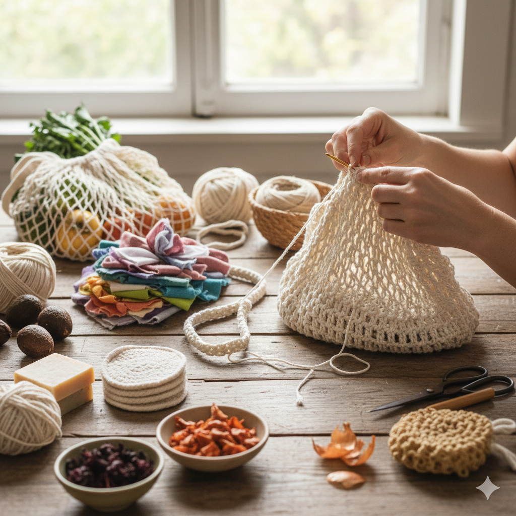 - Funcionalidad Reutilizable: Creación de artículos que sustituyen plásticos, como bolsas de compra de red, discos desmaquillantes lavables y esponjas vegetales. 🧼
