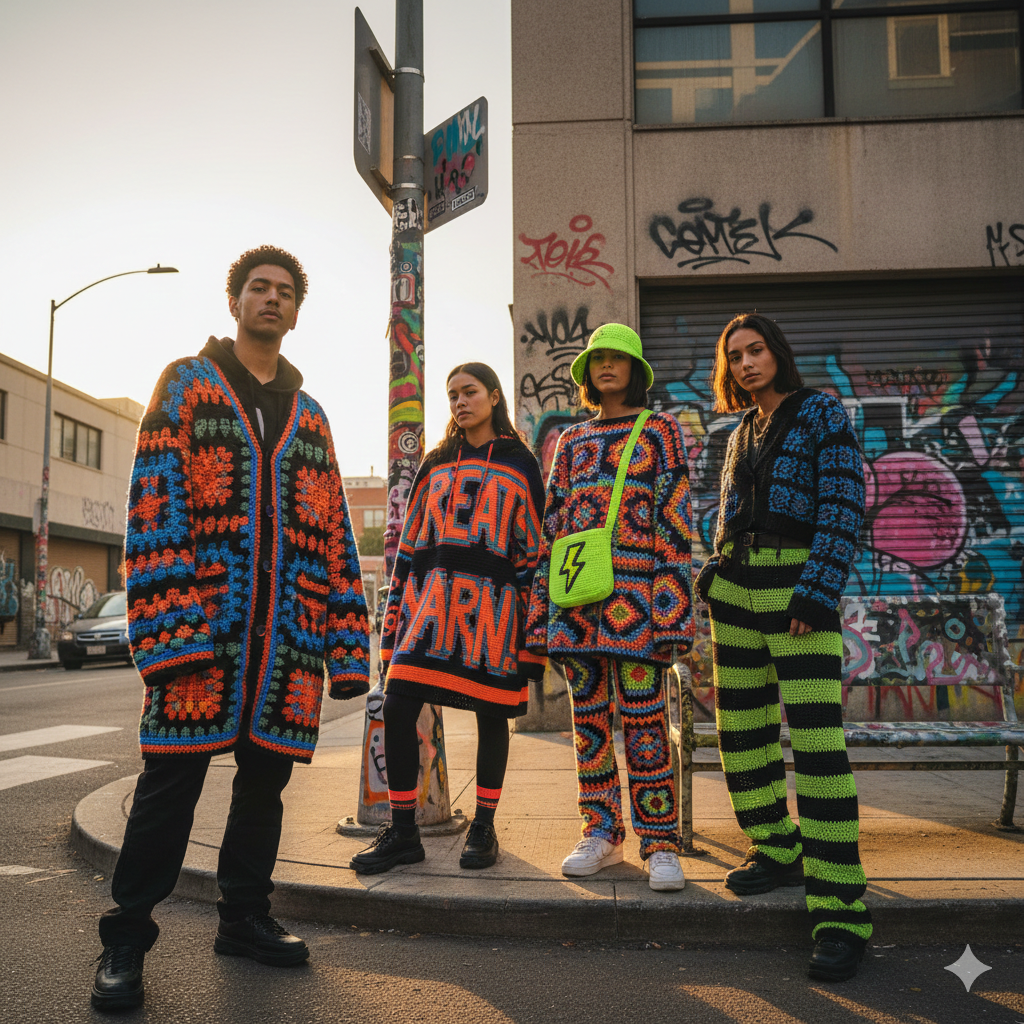 El Crochet Urbano rompe con el estereotipo tradicional del tejido para integrarse en el ritmo de la ciudad. Se inspira en la cultura del hip-hop, el skate y la moda de las grandes capitales. Es un estilo que busca la comodidad y la expresión de la identidad individual a través de prendas con cortes modernos, colores llamativos y una estética marcadamente juvenil y desenfadada.