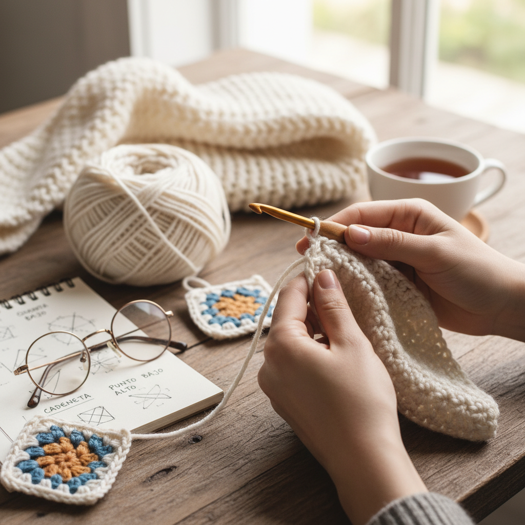 - Puntos básicos: Utiliza los pilares del tejido: cadeneta, punto bajo, punto medio alto y punto alto. 🔢
