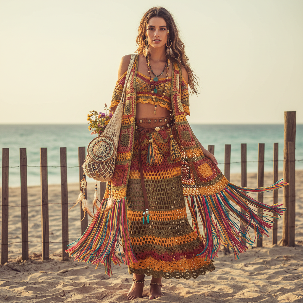 El Crochet Boho es la expresión máxima de la libertad y la creatividad. Inspirado en el estilo hippie de los años 70 y la estética nómada, este estilo combina texturas, flecos y colores de una manera ecléctica y relajada. Es un estilo que no busca la perfección simétrica, sino la calidez, la comodidad y un espíritu aventurero.