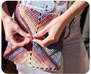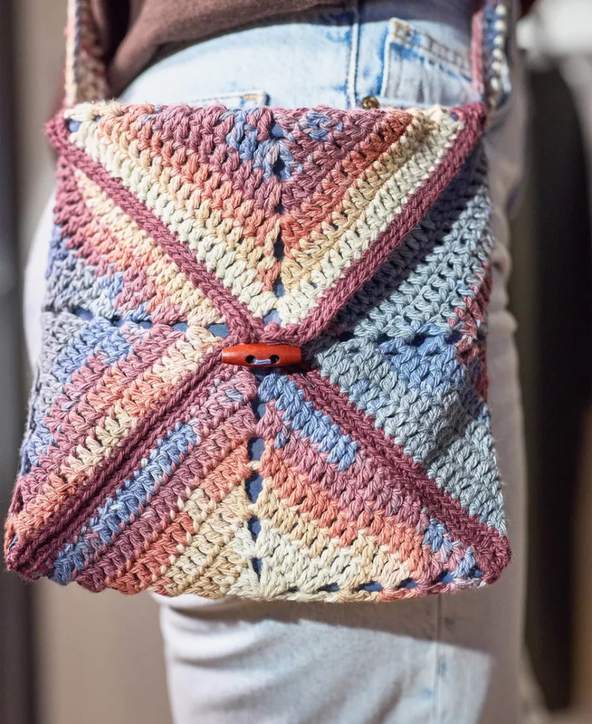 Este bolso está compuesto por 4 motivos que se cosen entre sí. Se cose un forro en el interior de los motivos ya ensamblados y luego se realizan las costuras finales del bolso. La correa se teje por separado y se cose al bolso.
