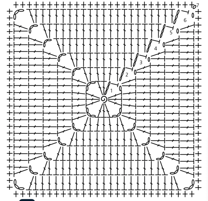 Vuelta 1: 3 cad (cuentan como PA), 2 PA en el anillo, [3 cad, 3 PA en el anillo] 3 veces, 1 cad, unir con medio punto alto en la parte superior de las 3 cad iniciales – 3 PA en cada lado.