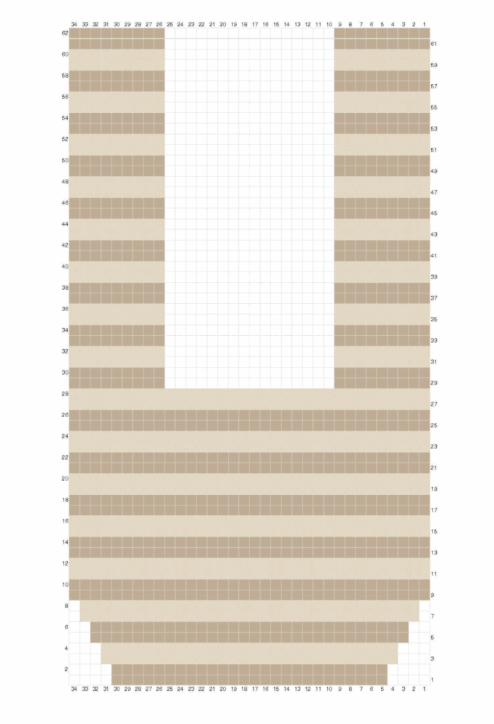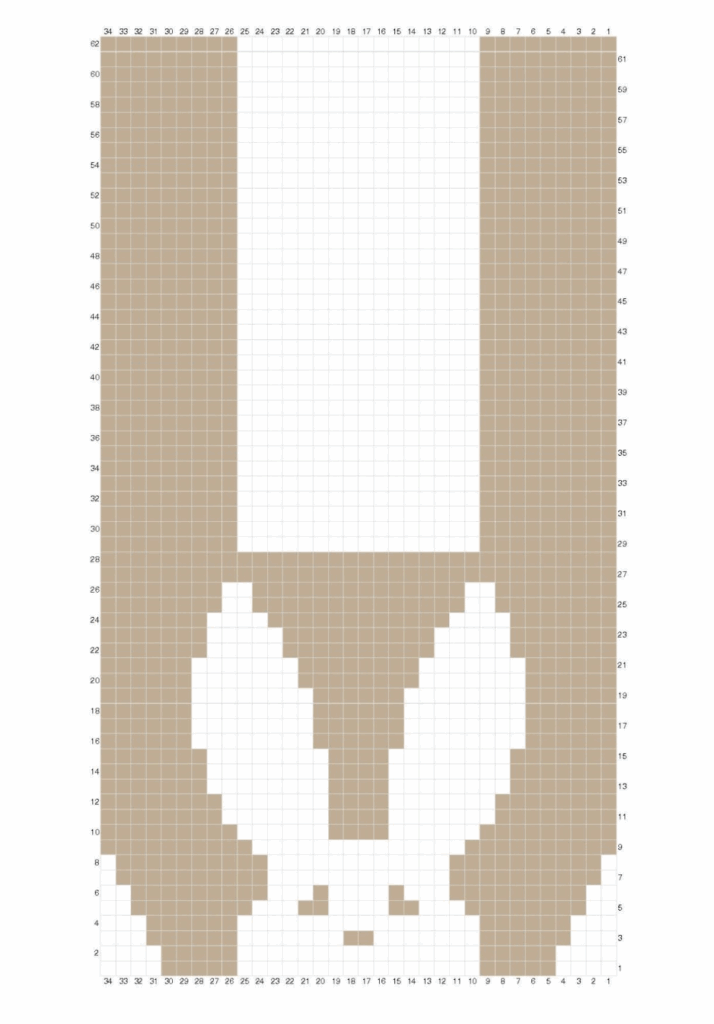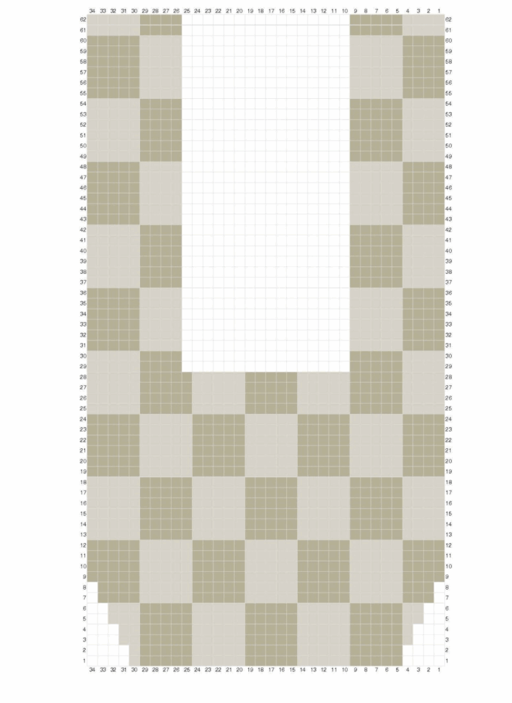Fila 8: Leer el gráfico de izquierda a derecha. Tejer 1 pb en cada punto siguiendo los cambios de color. Pasar el hilo Gris Pluma en el último paso del último pb. Hacer 1 cad y girar. (32 pb)