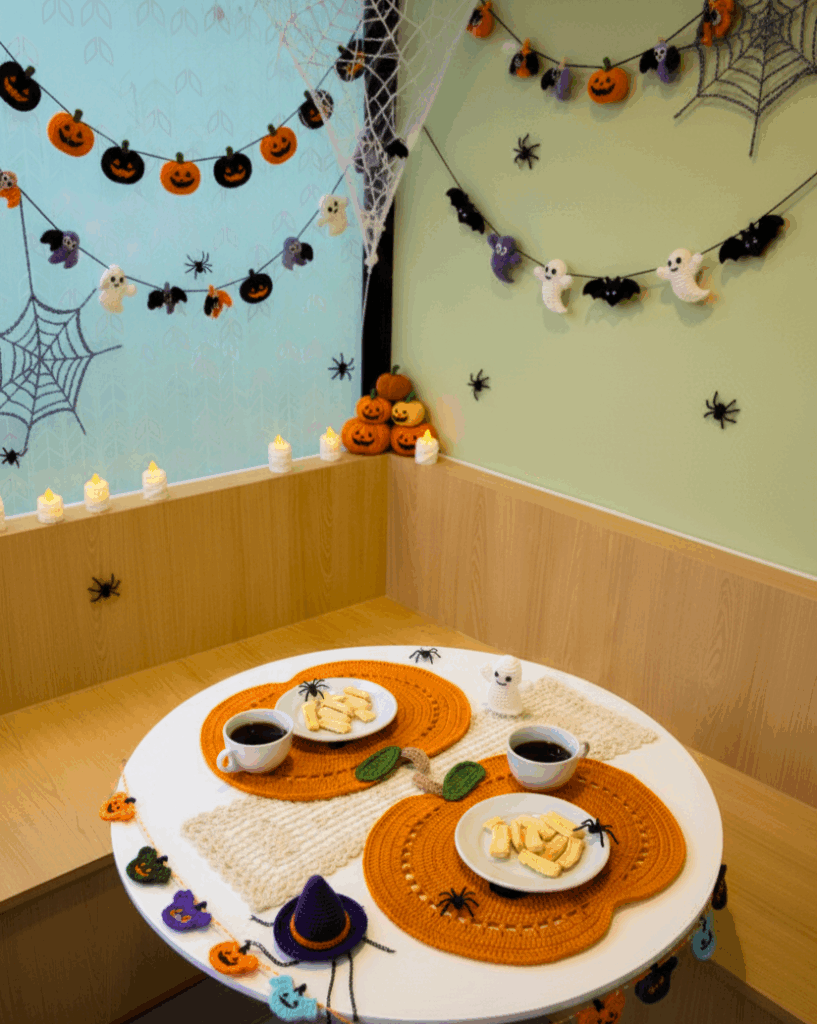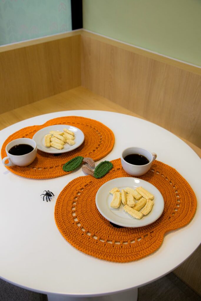 Hacer los posaplatos que quieras, recomiendo tejer grupos de 2, cuatro y 6 sillas, idénticos. ¡A disfrutar! 🎃☠️