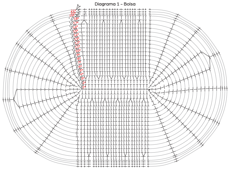 Vueltas 2–21: Continúa tejiendo en vueltas circulares en medio punto alto siguiendo la forma del bolso hasta alcanzar la altura deseada. Al finalizar, corta el hilo y reserva la pieza.