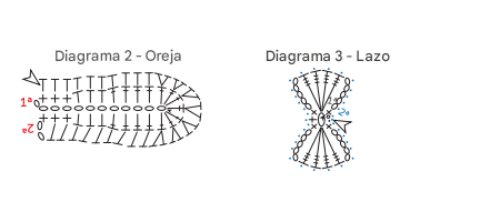 Teje una cadena de 12 puntos y trabaja filas de ida y vuelta formando la oreja siguiendo esta base: