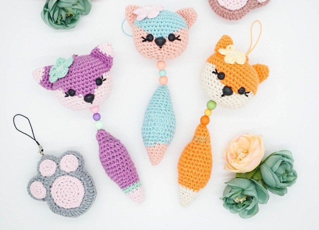 El Llavero de Zorro Amigurumi es una explosión de creatividad y ternura concentrada en una pieza miniatura 🦊💖. Este diseño destaca por su estética «kawaii», con cabezas redondeadas, mejillas sonrosadas y colas esponjosas que cuelgan con gracia. Lo más llamativo es su paleta de colores: desde el clásico naranja otoñal hasta versiones fantásticas en lavanda y turquesa, todos adornados con pequeñas flores tejidas que les dan una personalidad única y soñadora. 🌸✨