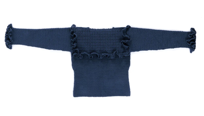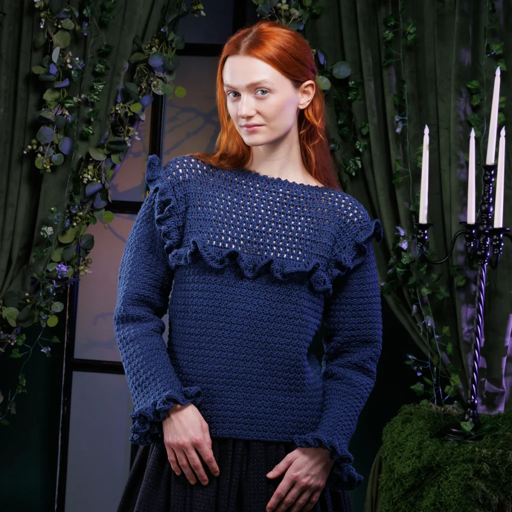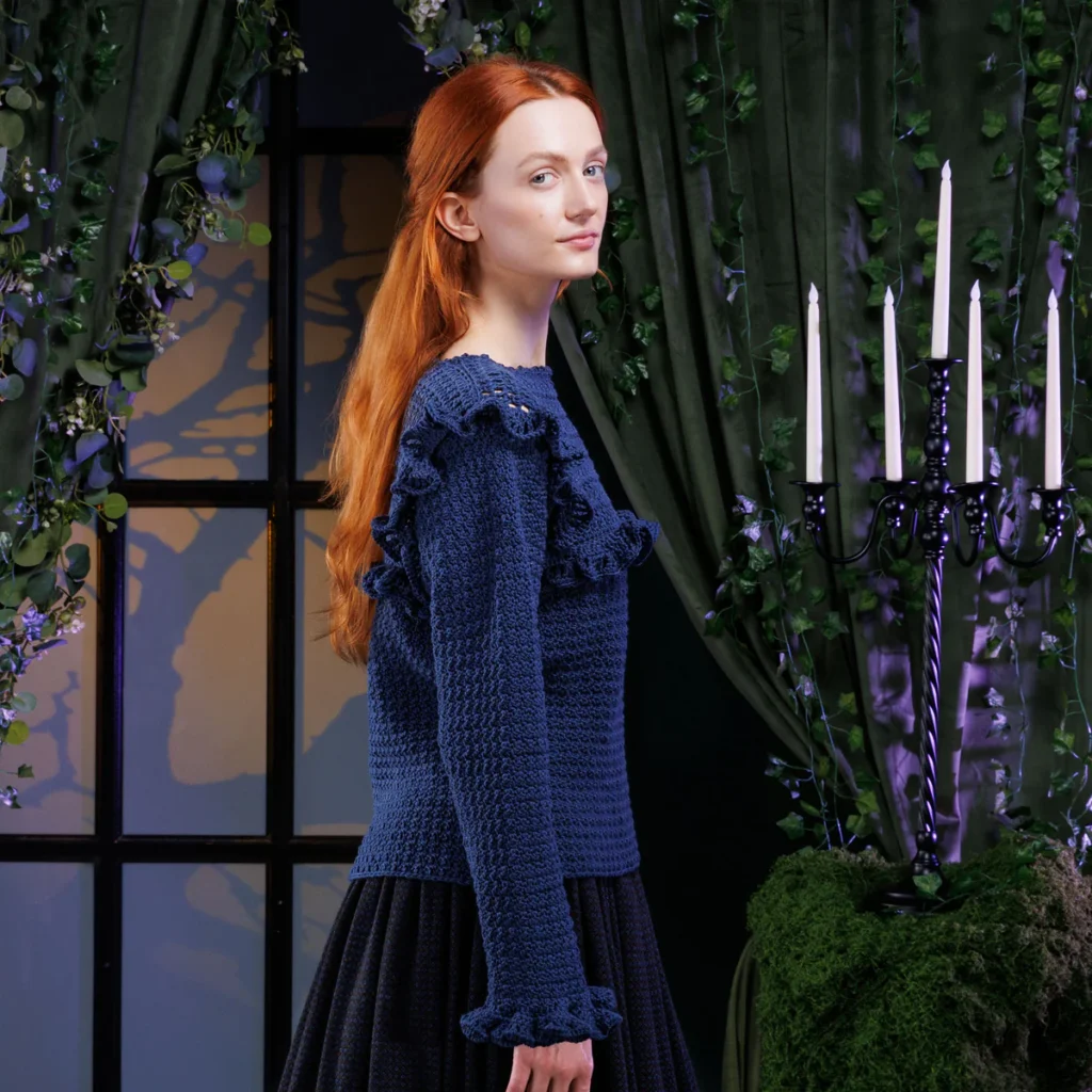 El top Giulia destaca por su cuello recto y puños acampanados. No olvides rematar el escote con una vuelta de puntos bajos o punto cangrejo para evitar que se estire con el uso. En los puños, repite la técnica de los volantes del pecho para crear un conjunto armonioso y equilibrado que estilice tus manos.