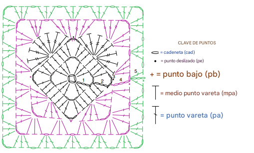 Insertar en hebra trasera del siguiente p de ambos motivos. Lazada y pasar por 3 hebras.
