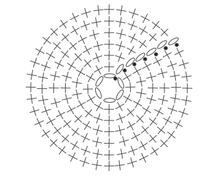 Vuelta 2 en adelante: Continúa en círculo con el mismo número de puntos. Cierra cada vuelta con un punto deslizado y empieza la siguiente con una cadeneta.