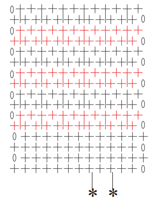 Un cuadrado de 10 cm en punto bajo con ganchillo 9,0 mm = 10 puntos x 10 filas.