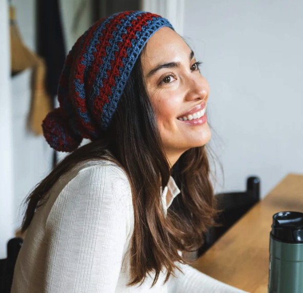 Lo maravilloso del Punto en V es que es una puntada abierta y elástica que crea una tela suave y con una hermosa caída, perfecta para un gorro slouchy con pompón. Es un excelente proyecto para PRINCIPIANTES que quieren practicar el cambio de color sin demasiadas complicaciones.