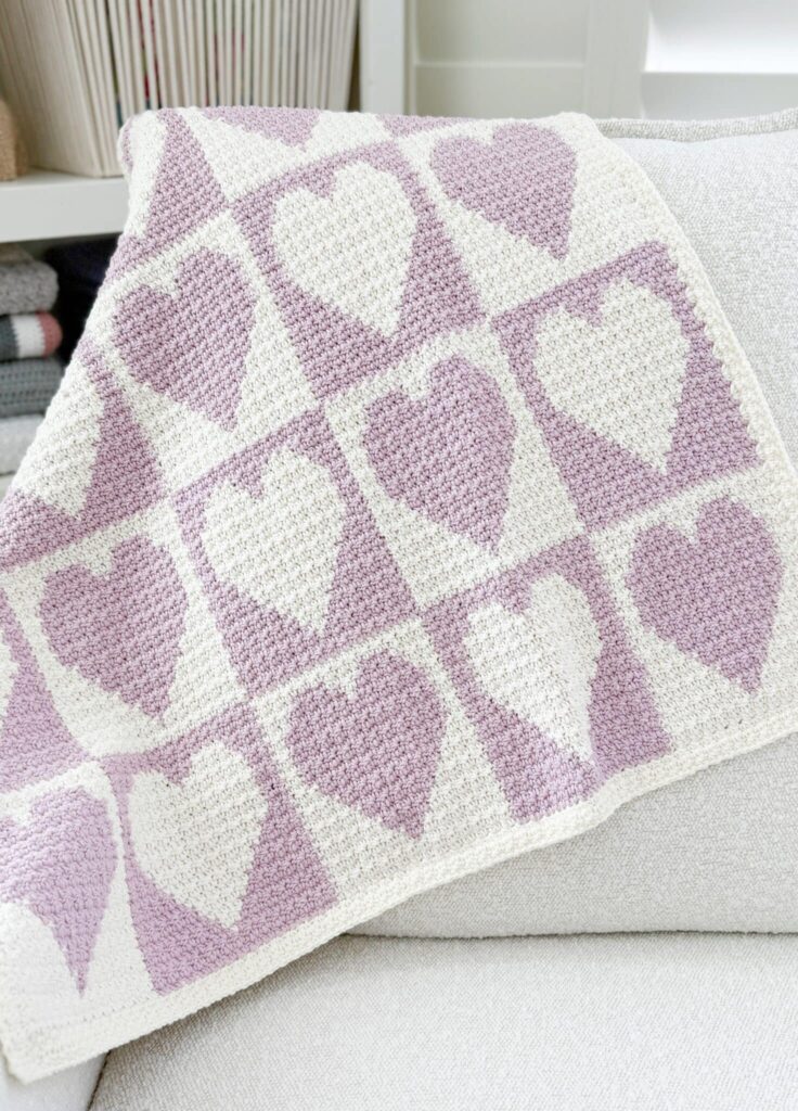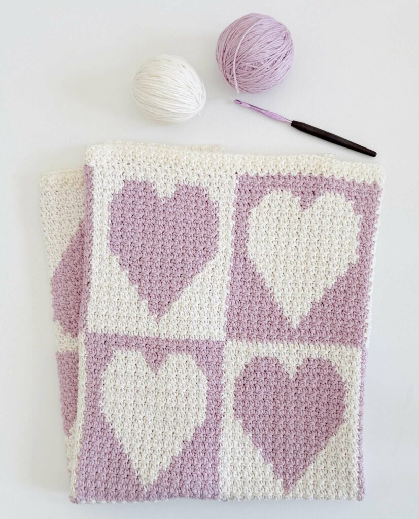 No dejes que el diseño Intarsia (o tapestry en este caso) de los corazones te intimide. Este proyecto se basa en la repetición de un patrón sencillo, y lo mejor de todo, tienes el gráfico para seguir la secuencia de colores de manera precisa. Este método no solo es divertido, sino que te permite ver el diseño de la manta crecer rápidamente, ofreciendo una gran satisfacción visual. 💪 Es la oportunidad perfecta para tejer una pieza hecha a mano que combina la calidez del crochet con un diseño moderno y atemporal. ¡Tu próxima manta favorita te espera!