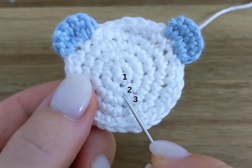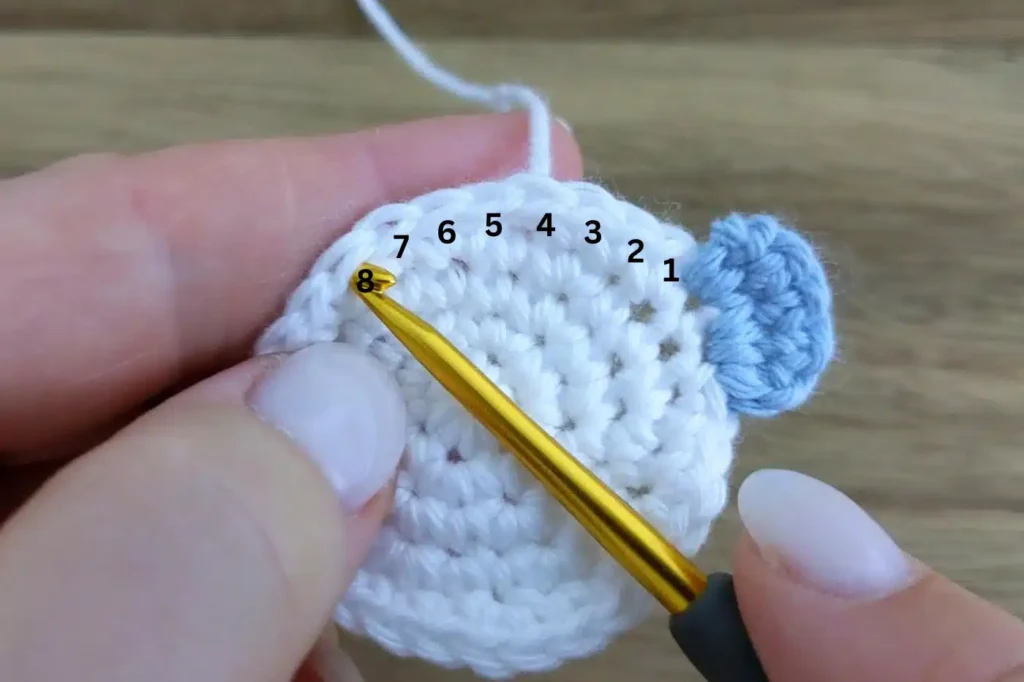 Une el hilo en el 8º punto a partir del último punto trabajado para la oreja derecha: