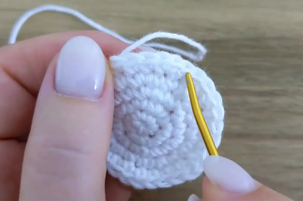 Vuelta 9. 2 cadenetas, 1 medio punto alto en el mismo punto (en la base de la cadeneta), 1 medio punto alto en los siguientes 29 puntos, punto deslizado al 1er medio punto alto para unir, NO GIRAR [30 puntos].