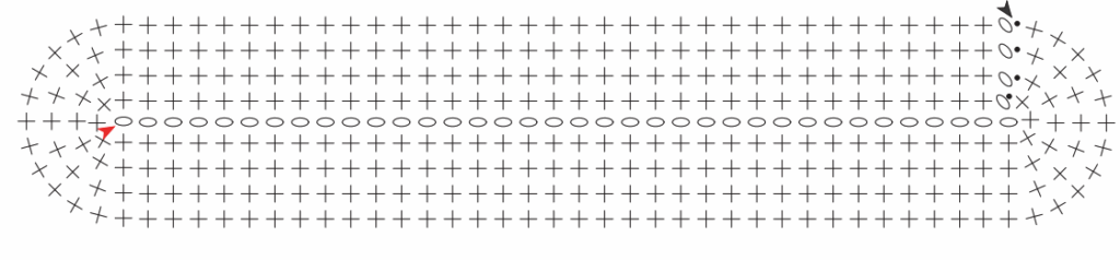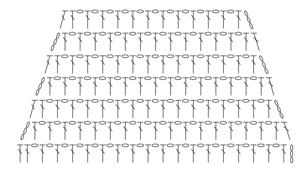 - Con hilo, haz una cadeneta de 36 puntos más 1 cadeneta para girar y trabajar la base del bolso siguiendo el gráfico.