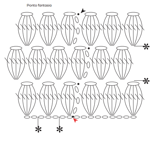 - Con hilo , continúa en círculo y en puntos fantasía siguiendo el gráfico, repitiendo de * a * en la dirección de los puntos (42 puntos).