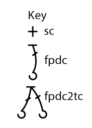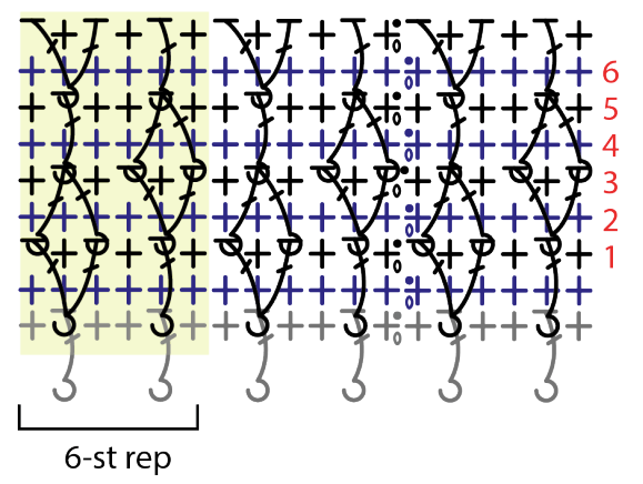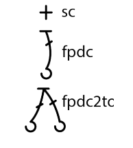 Vuelta 1 (LD): 1 cad, pb en pb, pa por delante en el pa por delante de 2 vueltas atrás Vuelta 1 (LD): pa por delante en el pa por delante de 2 vueltas abajo, saltar punto detrás del pa, pb en el siguiente pb, pa por delante en el siguiente pa por delante de 2 vueltas abajo, saltar punto detrás del pa, pb en el siguiente pb, pa por delante en el mismo pa por delante usado previamente; repetir alrededor, unir con pr al primer pb, girar