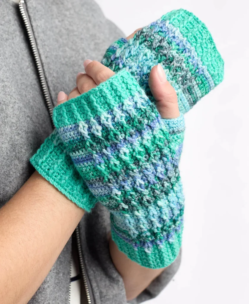 Los mitones se trabajan también en redondo, de abajo hacia arriba, en vueltas unidas y giradas.