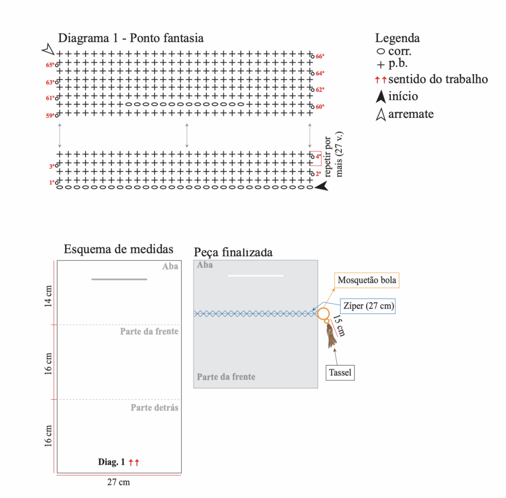 - Puntos utilizados en crochet: cadena: cadeneta, pb: punto bajo, punto fantasía: seguir diag. 1.