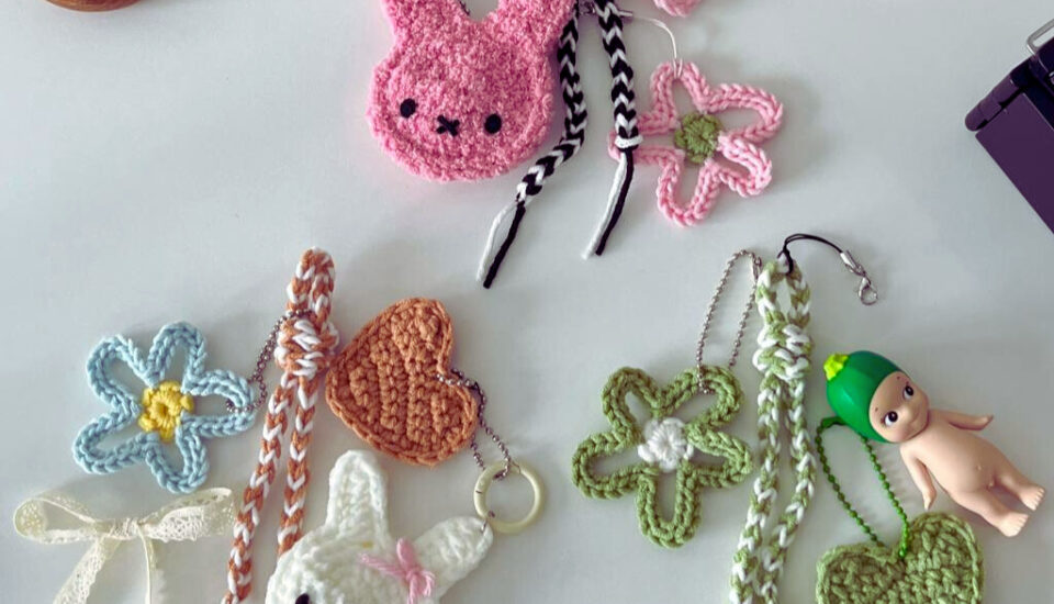 ste concepto de diseño es pura libertad creativa: se trata de combinar pequeñas figuras, como tiernos conejitos 🐰, flores abiertas 🌸, corazones texturizados 🤎 y cordones trenzados, para crear un accesorio lleno de personalidad y movimiento