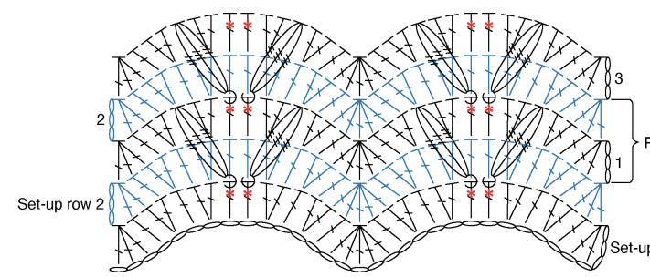 1.ª fila (LD): Cad 3, saltar el primer punto. Iniciar dc2juntos sobre los siguientes 2 pts. 1 pa en el siguiente pt. 2 pa en el siguiente pt. Grupo Dtrfp alrededor del punto marcado 2 filas más abajo. Saltar el siguiente pt en la fila de trabajo (detrás del grupo Dtrfp). Trabajando detrás del grupo Dtrfp, 2 pa en el siguiente pt, 1 pa en cada uno de los siguientes 2 pts (marcar los últimos 2 pa trabajados). 2 pa en el siguiente pt. Grupo Dtrfp alrededor del siguiente punto marcado 2 filas más abajo. Saltar el siguiente pt en la fila de trabajo (detrás del grupo Dtrfp). 2 pa en el siguiente pt, 1 pa en el siguiente pt. *Pa5juntos sobre los siguientes 5 pts. 1 pa en el siguiente pt, 2 pa en el siguiente pt. Grupo Dtrfp alrededor del siguiente punto marcado 2 filas más abajo. Saltar el siguiente pt (detrás del grupo Dtrfp). 2 pa en el siguiente pt, 1 pa en cada uno de los siguientes 2 pts (marcar los últimos 2 pa trabajados). Trabajando detrás del grupo Dtrfp, 2 pa en el siguiente pt. Grupo Dtrfp alrededor del siguiente punto marcado 2 filas más abajo. Saltar el siguiente pt (detrás del grupo Dtrfp). 2 pa en el siguiente pt, 1 pa en el siguiente pt. Repetir desde * hasta los últimos 3 pts. Pa3juntos sobre los últimos 3 pts. Girar.