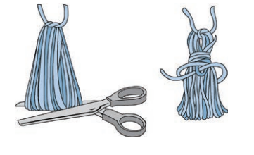 Envolver hilo alrededor de un cartón de 14 cm de ancho 20 veces. Atar firmemente por un extremo. Cortar los bucles en el extremo opuesto. Envolver hilo 3 veces alrededor de la borla a 2.5 cm del extremo atado. Asegurar bien y recortar los extremos de manera uniforme. Coser 1 borla centrada en cada punta a lo largo de los bordes superior e inferior de la manta, incluyendo 1 borla en cada esquina