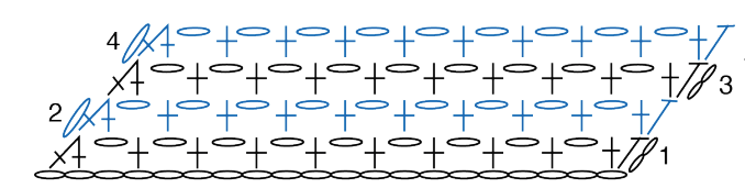 Fila 1 (LD): (1 MPB, 1 PB) en la 3ª cad desde el ganchillo. (Cad 1, saltar 1 cad, 1 PB en la sig. cad) repetir 3 veces. Cad 1, saltar 1 cad. (1 PB, 1 MPB) en la última cad. Girar. 11 pts
