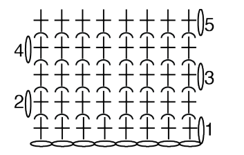 Vta 5: Cad 1. 2 PB en el mismo punto del PE. 1 PB en los siguientes 27 PB. 2 PB en cada uno de los siguientes 3 PB. 1 PB en los siguientes 27 PB. 2 PB en cada uno de los últimos 2 PB. Cerrar. 66 PB
