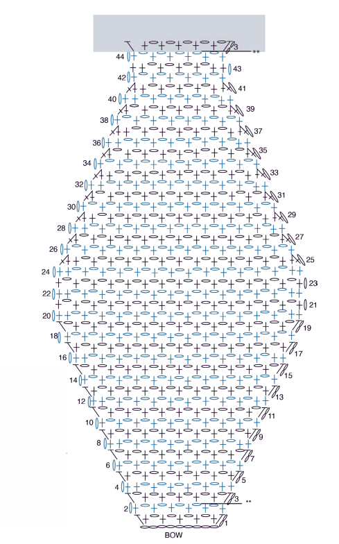Fila 27: Cad 1. DISM. Cad 1, saltar 1 PB, 1 PB en el espacio de cad-1 repetir hasta los últimos 3 pts. Cad 1, saltar 1 PB. DISM. Girar. 25 pts
