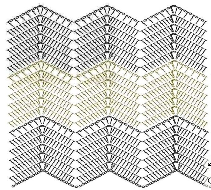 Fila 1: 1 pa en la 4ª cad desde el gancho (las 3 cad cuentan como 1 pa), 1 pa en las próximas 3 cad, 3 pa en la siguiente cad, 1 pa en las próximas 5 cad, saltar 2 cad, 1 pa en las próximas 5 cad. Repetir desde * hasta completar la fila. Girar. (78 pts)