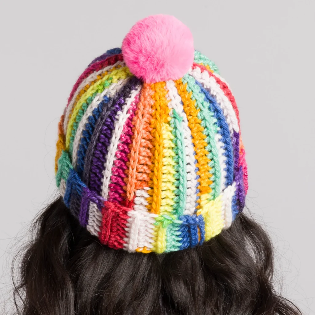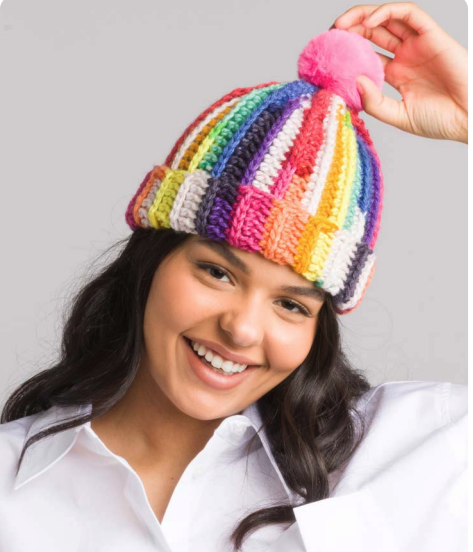 ¡Despídete de los gorros aburridos y dale la bienvenida al color! Este vibrante Gorro Prismático a Crochet es la pieza perfecta para inyectar alegría y personalidad a tus días fríos. Tejido con un espectacular diseño de rayas verticales en todos los colores del arcoíris, y coronado con un divertido pompón rosa, este gorro es una declaración de moda que celebra tu pasión por el ganchillo. ¡No hay necesidad de comprar gorros genéricos cuando puedes tejer una obra de arte tan única!
