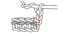 2a Vuelta: 1 c. Trabajando en el bucle horizontal acostado debajo del siguiente punto (ver diagrama) , 1 mpa en cada uno de los siguientes 25 mpa. Trabajando solo en el bucle delantero (FLO), 1 pb en cada uno de los siguientes 6 pb. Girar.