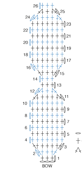 Fila 1 (LD): 2 pb en la 2.ª cad desde el gancho, 1 pb en cada cad hasta las últimas 2, pb2juntos. Girar. (20 pts)
