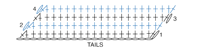 Fila 1 (LD): 1 pb en la 2.ª cad desde el gancho, 1 pb en cada cad hasta el final. Girar. (3 pb)