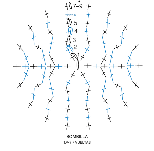 V1: 6 pb en la 2.ª cad desde el ganchillo. Unir con 1 pdesl. (6 pb)