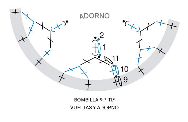 V10: 1 cad. 1 pb en el primer pb. 1 dis, 1 pb en el siguiente pb. Repite desde * hasta los 2 pb finales, luego 1 dis. Unir con 1 pdesl. (12 pb)