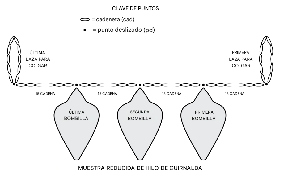 *Haz 15 cad, luego 1 pdesl en el tope de la primera bombilla. Repite desde * hasta que todas las bombillas estén unidas, asegurándote de que todas miren en la misma dirección.