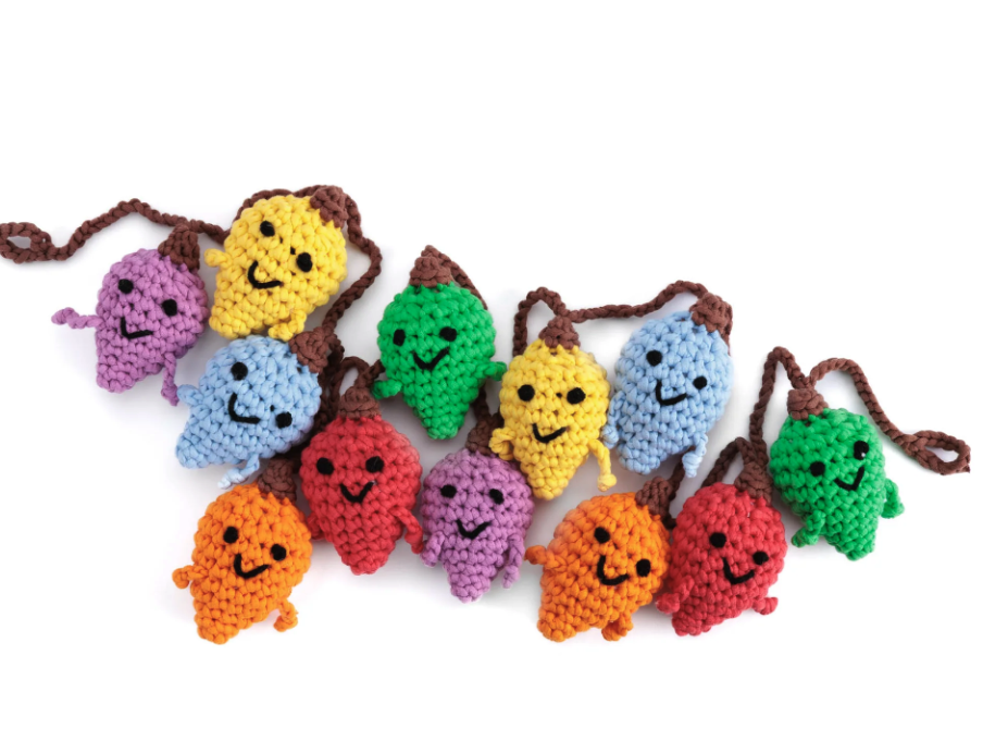Este patrón es perfecto si buscas un proyecto de amigurumi sencillo y rápido. Las bombillas son figuras pequeñas y compactas, ideales para practicar el trabajo en espiral, el relleno y el bordado de detalles. Lo mejor es que te permite jugar con toda tu paleta de colores (rojo, amarillo, azul, verde, morado y naranja), lo que hace que el proceso de tejer sea muy dinámico y alegre. Es un proyecto de gratificación instantánea, pues verás tu guirnalda crecer rápidamente.