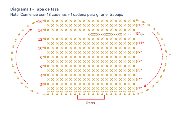 Con hilo almendra: 48 cad + 1 cad para girar. 1ª vuelta: desde la 2ª cad, 48 pb. Vueltas 2-16: 1 cad, 48 pb. Vuelta 17: 17 cad, unir con 1 pd al lateral de la 1ª vuelta. Siguiendo el diagrama 1, tejer 48 pd en la parte inferior. Hacer 17 cad y unir con 1 pd al lateral de la última vuelta. Rematar.