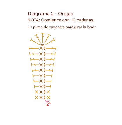 Con hilo café: 10 cad + 1 cad. 1ª vuelta: 10 pb. Rematar. 2ª vuelta (almendra): 1 cad, 2 pb, 3 pma, 5 pa, 5 pa en el mismo p., 5 pa, 3 pma, 2 pb. Rematar. Hacer 2 y coser siguiendo el diagrama de montaje.
